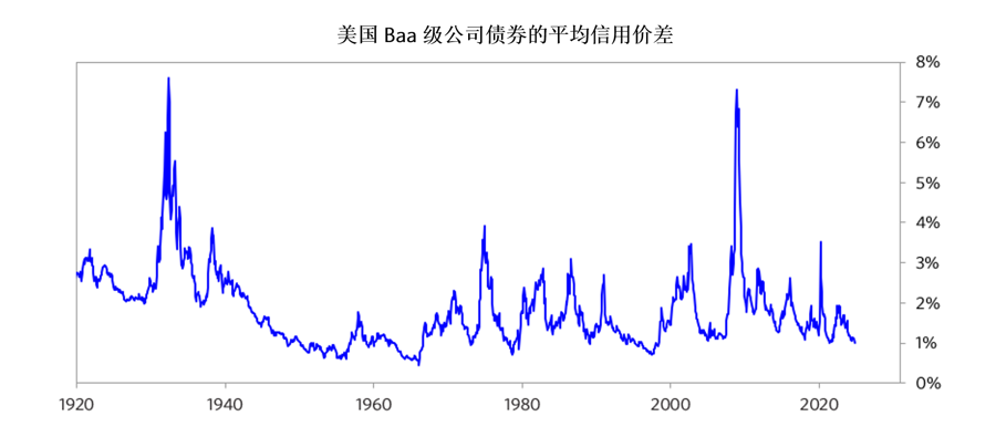 迄今为止,我仅仅展示了国债利率的大致情况,但这并非个人、企业及地方政府借款时所适用的利率。因此,关注信用价差是很有帮助的。下图展示了自1920年以来Baa级公司债券的平均信用价差。