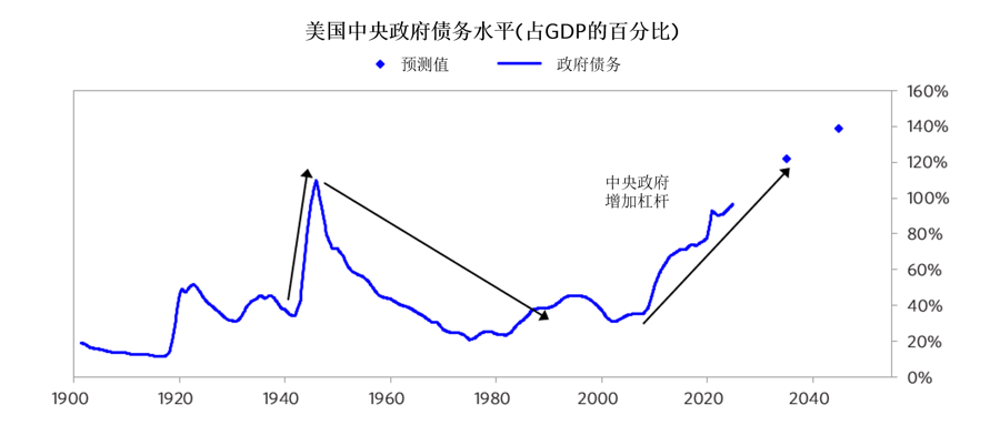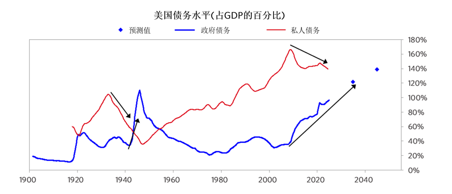 下图显示了美国中央政府债务相对于GDP的比例,圆点代表CBO对10年和20年后的预测。如图所示,这一比例正在一个大周期中演变,目前已达到自1946年(第二次世界大战结束后)以来的最高水平,预计未来会显著攀升。