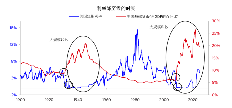 1980-2008年,即便债务水平持续上升,降低利率也足以让债务的还本付息在可承受范围之内。但在2008年,利率几乎降至零,就如同1933年之后那段时期的情况一样,私人市场对债券的需求不足以消化债券的供给,于是中央银行介入,通过印钞来购买债券,这对长期利率形成了下行压力。这种情况出现过两次,第一次是为了应对1929-1933年由债务危机引发的大萧条,当时的利率降至零;第二次则是为了应对2008年由债务危机引发的大衰退,当时的利率也降至零。(你可以在下图中看到这一情况,小圆圈表示印钞的开始以及利率降至零的时间点。)如果我们没有研究过图中所示的这段时期我就不会了解这些情况,桥水基金在这一时期也不会取得成功。这也是促使我首次发现大债务周期运行机制的原因。
