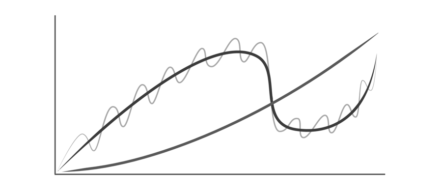 需重申的是,我认为存在短期的货币/信贷/债务/经济周期,这些周期叠加形成长期的货币/信贷/债务/经济周期。而长期周期又围绕着生产率的上行趋势产生波动——生产率的提升源于人类的创新能力,尤其新技术的突破。因此,通过更形象的方式展示,上述过程的运行轨迹大致如下。