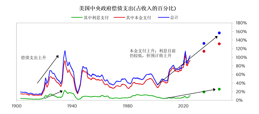 让我们审视下图,它展示了美国中央政府的总偿债支出(本金支付加上利息支付)相对于其财政收入的比例,以及其中本金支付和利息支付各自所占的份额。值得注意的是,1950-2000年,偿债支出大致持平;这是因为在那段时间,政府债务水平大致持平或略有下降,因此本金支付也大致持平或略有下降。1950-1990年,利息支付略有上升,因为政府债务的平均利率缓慢上升,然后从1990年到大约2022年,利息支付有所下降,因为政府债务的平均利率缓慢下降。
