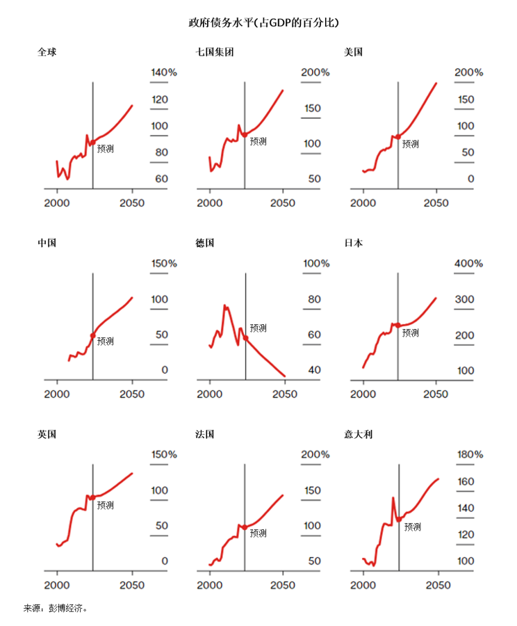 在以上部分,我重点关注了美国的债务状况。你可以在下图中看到,这并不仅仅是美国的问题。预计在未来几十年里,所有发达国家的债务负担都将大幅增加。要明白未来几年如何制定政策以及如何在市场中进行交易,关键在于了解这些动态将如何发挥作用。