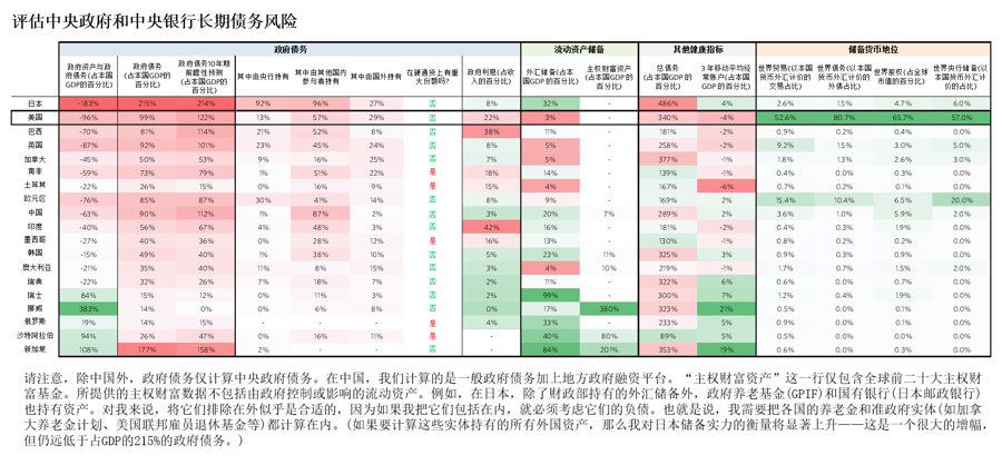 在对风险进行评估时,我会权衡多种因素,其中许多因素我已经描述过,而最重要的因素则体现在下表中。其展示了截至我于2025年3月撰写本书时主要国家的相关指标。尽管这些指标并非我所有的指标,也不足以呈现完整的图景,但它们足以勾勒出一个较为清晰的轮廓。你可以将下表视为一个仪表盘,其粗略地描绘了当前的健康状况,以便评估中央政府和中央银行的长期债务风险。除了展示现有及预期的债务和偿债水平带来的风险外,表格中还包含了一个国家是否为储备货币国的衡量标准,因为作为储备货币国,即其货币被全球广泛接受为交易媒介和财富储存手段,是一个极大的风险缓解因素,尤其如果该国属于理想投资目的地的情况下,正如当前美国及其货币和债务所体现的那样。