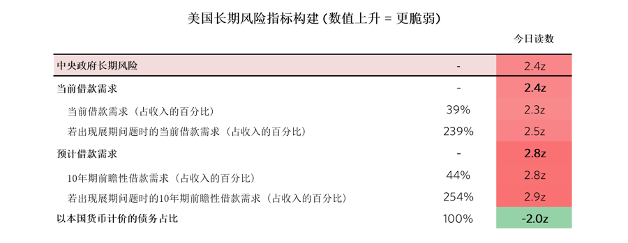 下表展示了一些对美国中央政府长期风险评级最为关键的指标。它是以Z分数来衡量的,也就是高于或低于平均值的标准差。你只需要知道,数值高于2就相当糟糕了。