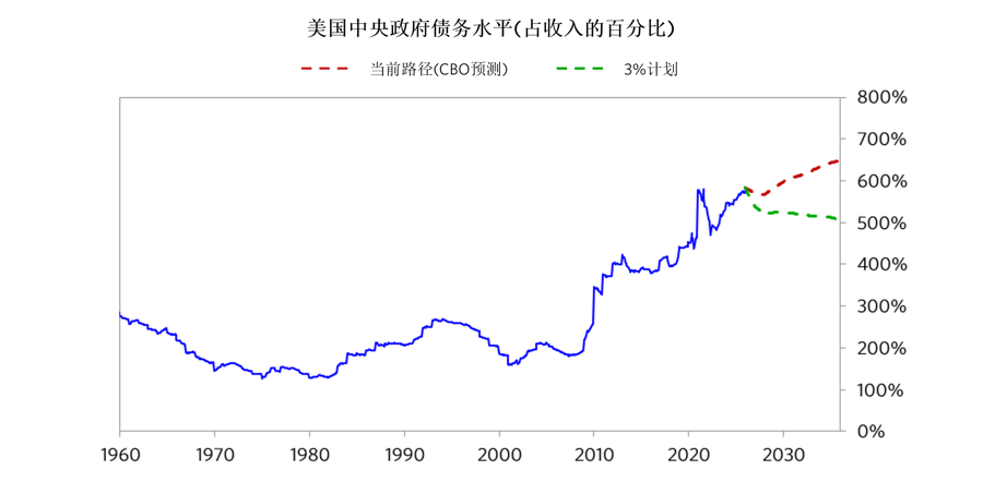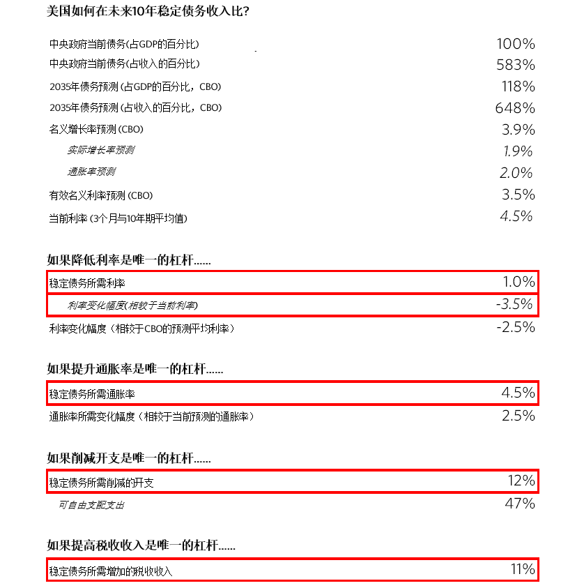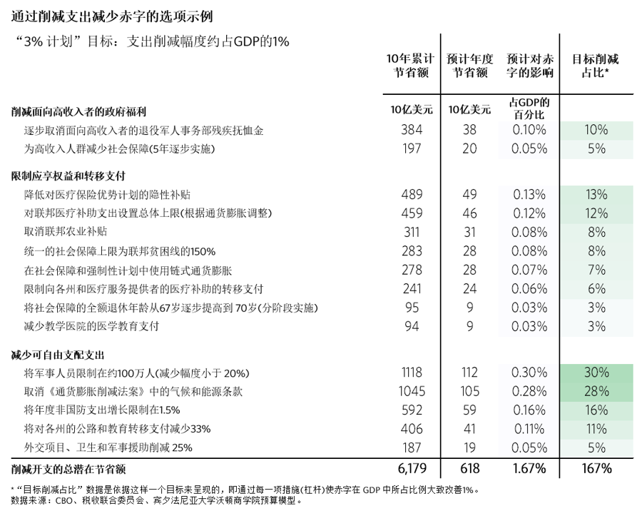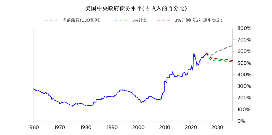 - 预算赤字应削减至GDP的3%(相较于CBO当前预测的约6%)。