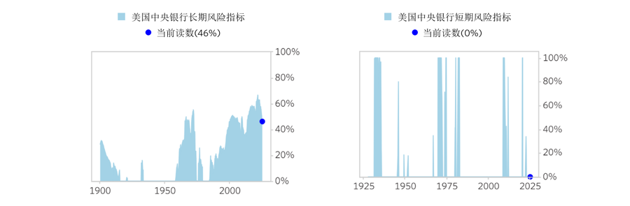 利用上述指标以及之前所描述的其他指标,我对中央政府和中央银行的长期风险(我把衡量这种风险类比为衡量患心脏病的长期风险)和短期风险(就像衡量心脏病实际发作的情况及其造成的损害)进行了评估。虽然短期风险往往是由于长期存在的脆弱性在突发问题中显现出来(就如同一个长期面临心脏病发作风险的人真的心脏病发作了),但情况并不总是如此。例如,即使潜在的长期脆弱性较低,也可能会出现像新冠疫情这样的大流行病,或者爆发战争,这会导致更高的短期风险,而这会在这个风险指标中体现为数值上升。我对美国长期和短期风险的评估结果显示在接下来的图表中。请注意,尽管这些是很好的指标,但就像大多数预测某人是否会心脏病发作的先行指标一样,由于之前所解释的原因,它们并不是非常精确。