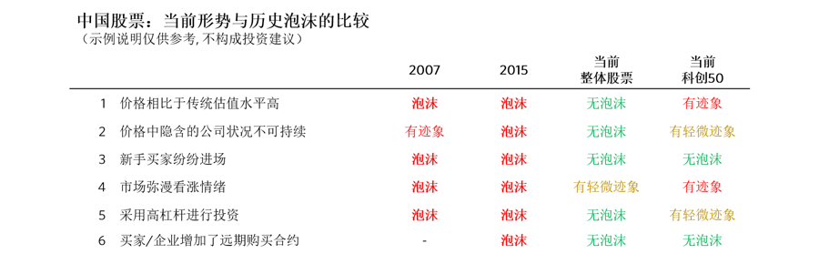下表将该分析框架应用于中国股票,对比当前的市场形势与2007年、2015年两次泡沫时期的差异: