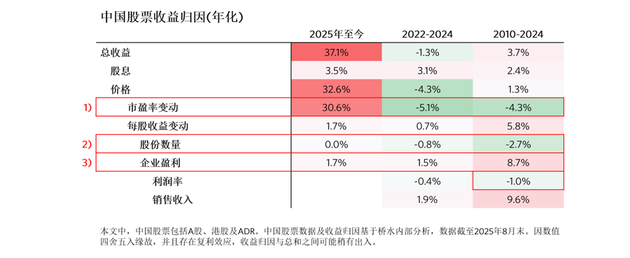 在分析当前中国股票之前,可以先退一步,回顾我们对于中国股票历史表现的观察。我们在下表中对于中国股票历史表现背后的驱动因素进行了拆解。