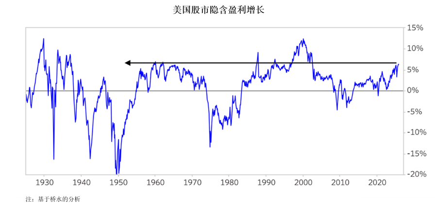 美国股市的定价反映出,曾经推动所有行业(不仅限于科技股)上涨的有利条件将持续:创纪录的盈利增长,温和的波动率,以及持续的政策支持。当前市场所反映的盈利增长预期,乐观程度处于过去近100年中的高位,仅次于互联网泡沫时期。