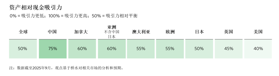 目前,我们观察到拥有以下特点的经济体的市场或许更具有吸引力,即有更大意愿和能力实施宽松政策,且资本流动风险较低——这类市场通常位于美国之外。以下是我们评估不同经济体风险资产吸引力的指标,综合考虑了政策压力、政策制定者面临的约束和风险溢价结构。如下图所示,亚太经济体在全球范围内具有突出吸引力。
