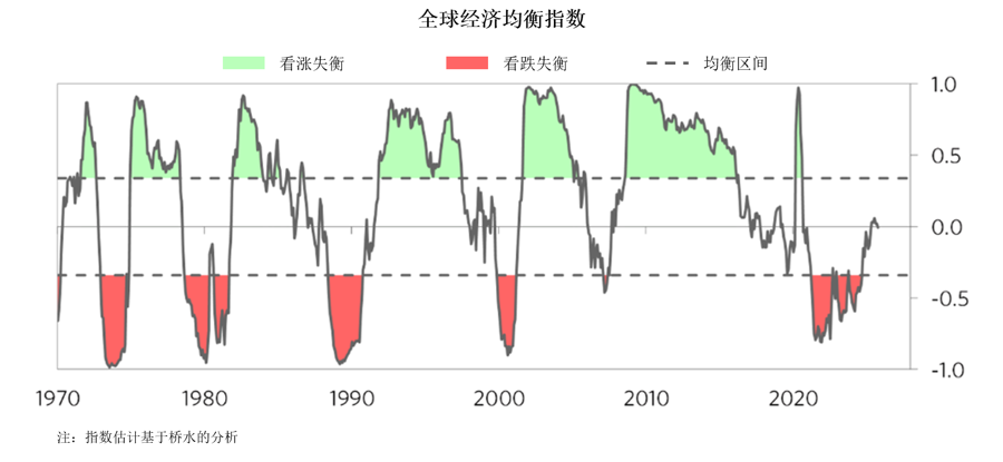 现代重商主义和人工智能(AI)变革的快速发展正在加速重塑地缘政治、经济和市场格局。尽管在这样复杂且快速演变的背景下,今年年初我们所观察到的周期性均衡状态至今仍基本保持不变。总体而言,从全球范围来观察,目前多数经济体仍处于“均衡区间”(即经济增长和通胀相对均衡的状态)。但需注意的是,正如下方图表所示,即便在正常时期,周期性均衡在被外界因素打破前,通常也难以长期维持。