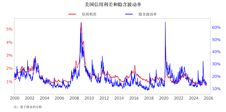 当今世界存在诸多引发波动的因素,但市场对风险的衡量却未受影响。信用利差和隐含波动率仍保持在较低水平,这与“当前均衡状态将持续”的预期相符。结合上下两张图表,可以看出,当前市场所隐含的未来结果区间呈现出“陡峭且狭窄”的特征,这意味着市场分歧相对较小,且对特定趋势的押注高度集中。