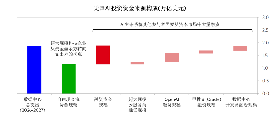 下方柱状图展示了2026年至2027年AI资本支出预计所需资金的来源,包括企业自由现金流和外部融资。超大规模科技企业的内部现金流可以覆盖约超一半的预期支出,其余的资金需求仍需要依赖外部融资。