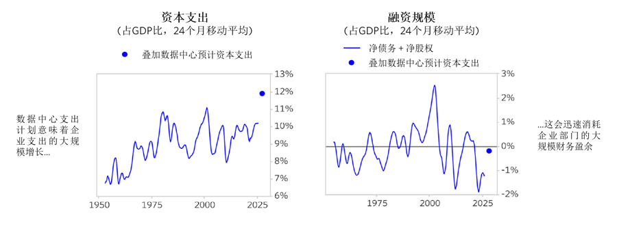 下图体现了这一显著变化:数据中心未来预计支出规模庞大,将推动资本支出占GDP比重达到数十年来的最高水平。这样的支出水平意味着,随着AI领域出现了大量的融资需求,美国企业部门大规模且不断增长的财务盈余将被迅速消耗。