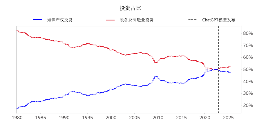 从1980年到2020年,美国经济从以实体投资为核心的工业强国,转向由软件、知识产权和无形资产主导的模式,后者占据的利润份额持续扩大。如今,这一主导地位正逐渐消退,轻资产时代并未终结,但它们已不再是默认赢家。我们观察到: