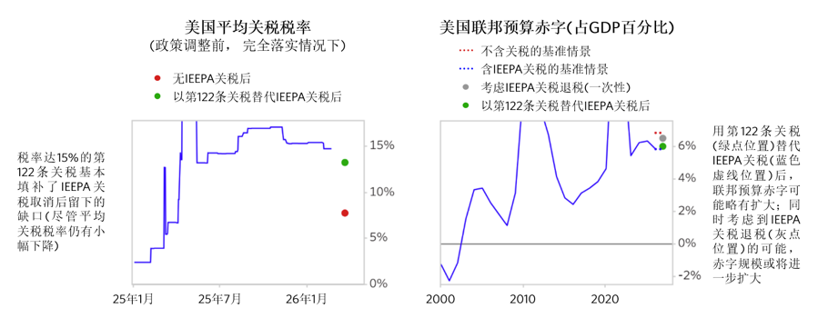 下方组图展示了近期特朗普政府政策调整对美国关税税率和财政赤字的影响。如第一张图所示,第122条关税填补了取消IEEPA关税后留下的大部分(尽管并非全部)缺口。这意味着关税调整带来的财政影响比较有限(如第二张图中的绿色圆点所示)。此外,关税退税带来的影响或将在短期内进一步推高美国财政赤字(如第二张图中的灰色圆点所示),但这属于一次性压力,而非政府财政状况的持续性转变。