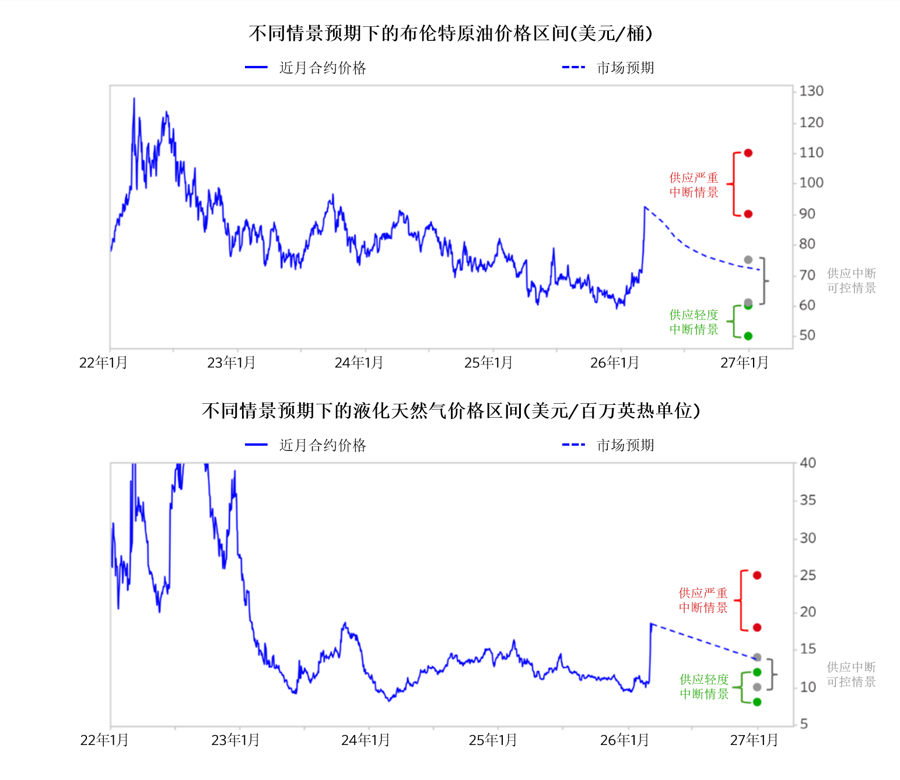 最后,在下方图表中,我们展示了目前原油和液化天然气的价格走势。在这两个市场中,当前现货价格均已反映出了供应严重中断的预期,但期货市场则预期了冲击带来的影响很可能将在一年内消退。