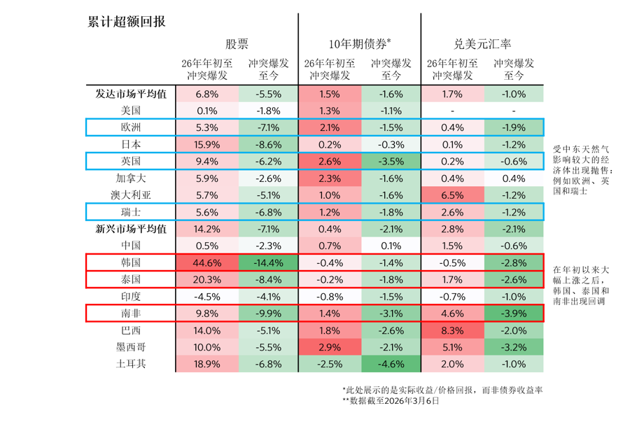下方表格展示了自年初以来及冲突爆发以来,股票、债券和外汇市场的整体表现。在冲突期间,几乎所有资产都出现了抛售。市场走势的一个主要驱动因素,是对中东天然气高度依赖的欧洲的资产遭到抛售(以下蓝色部分)。同时,一些在冲突爆发前大幅上涨的资产下跌也较为显著(以下红色部分),不过其中部分市场已经开始修复。