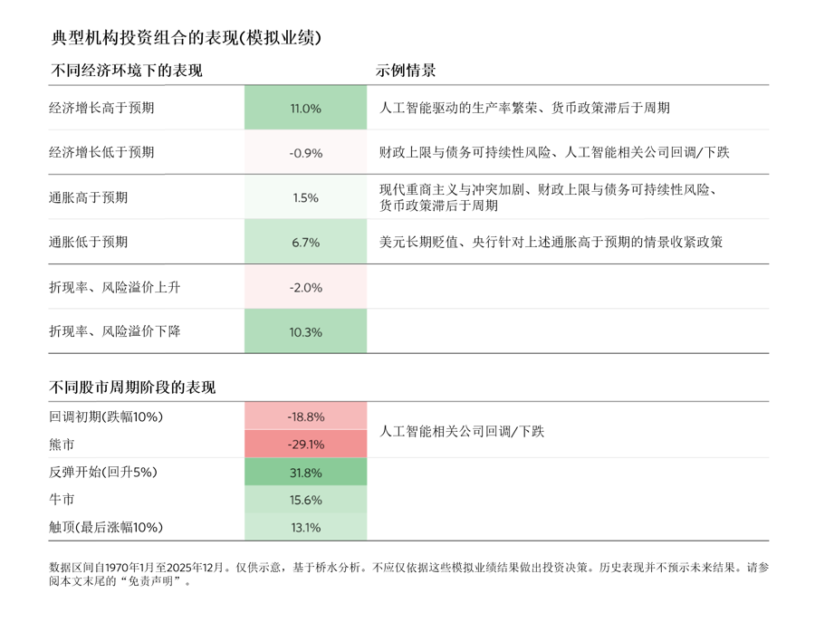 - 历史只是世界演变的其中一种路径。因此在上述历史表现之外,我们还会进一步理解资产回报背后的驱动因素及其对不同经济环境的偏好。这些基本驱动因素是相对稳定且可理解的,因此只要能够合理预判未来经济与市场环境的走向,就能理解其对资产和投资组合的潜在影响。如下图所示,通常而言,典型的机构投资组合在经济增长高于预期的环境中表现强劲,而在经济增长低于预期的环境中表现不佳;在通胀高于预期的环境中表现不及其平均水平,且在流动性收紧的环境中亦会表现不佳。此外,由于这类投资组合的风险往往集中在股票上,因此其在股票下行的环境下,所受冲击通常较为显著。