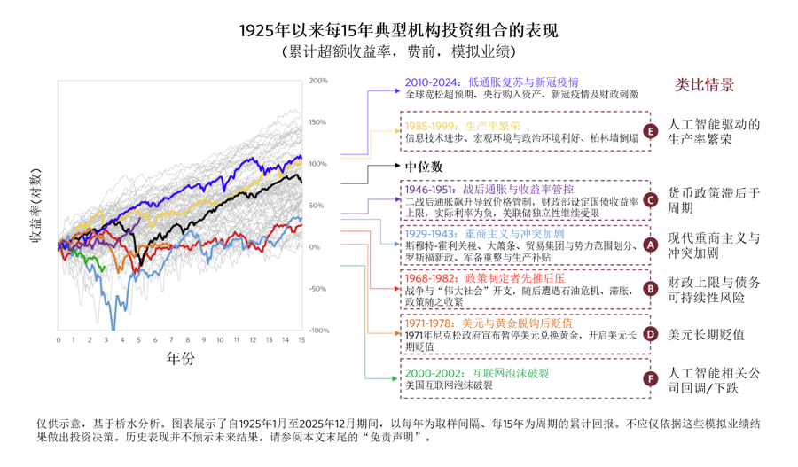 - 要理解投资组合未来可能面临的各种情景,一个有效方法是在历史相似时期对其进行压力测试。通过观察相似历史阶段的资产表现,我们可以推演未来若出现类似风险,投资回报可能落入怎样的区间。下图展示了自1925年以来,一个典型的机构投资组合在每一个15年区间内的表现。可以看出,不同时期的表现差异显著。