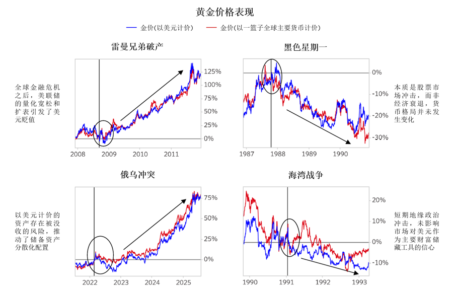 我们认为,回答这个问题,首先要厘清黄金作为投资资产的独特属性,以及投资者应合理预期其能够抵御的风险类型。尽管黄金素有财富储藏工具之称,但在市场避险情绪升温或遭遇各类地缘政治危机时,它并非总能提供稳定的保护。比如,在雷曼兄弟破产、黑色星期一、新冠疫情初期对金融市场的冲击,以及特朗普政府“解放日”关税政策引发的市场恐慌阶段,黄金均出现过下跌行情。黄金的财富储藏价值,主要源自以下三个属性: