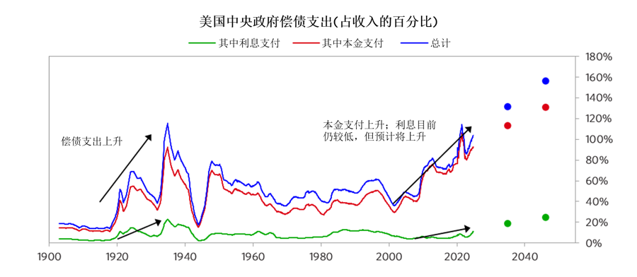 让我们审视下图,它展示了美国中央政府的总偿债支出(本金支付加上利息支付)相对于其财政收入的比例,以及其中本金支付和利息支付各自所占的份额。值得注意的是,1950-2000年,偿债支出大致持平;这是因为在那段时间,政府债务水平大致持平或略有下降,因此本金支付也大致持平或略有下降。1950-1990年,利息支付略有上升,因为政府债务的平均利率缓慢上升,然后从1990年到大约2022年,利息支付有所下降,因为政府债务的平均利率缓慢下降。