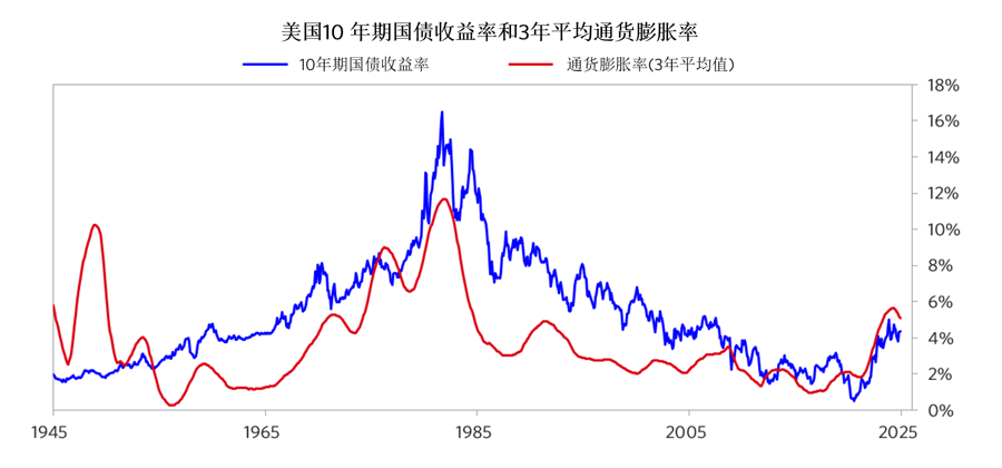 下图展示了10年期国债收益率和3年平均通货膨胀率。利率与通货膨胀率之间的关系非常重要,因为当利率相对于通货膨胀率较高时,人们会有储蓄以赚取利息的动机;而当利率相对于通货膨胀率较低时,人们会有借贷的动机,并持有那些能够从通货膨胀及低利率所促进的经济增长中受益的资产。