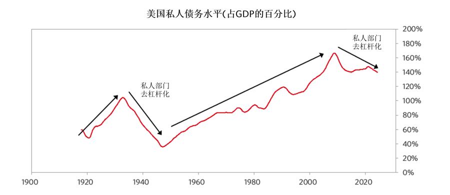 下图显示了自1900年以来美国私人债务相对于GDP的比例。1945年开始的当前大债务周期清晰可见。注意,2008年的私人债务(占GDP的百分比)达到峰值,此后略有下降。出现这种下降是因为美国中央政府和中央银行通过大规模介入来帮助私人部门,这在后续两幅图中有所展示。在书中的前几个部分我们提到过,这是大周期晚期阶段开始时的典型特征。
