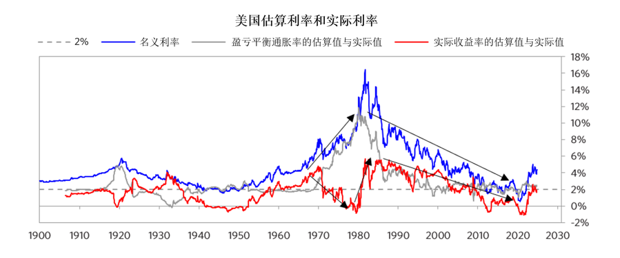 当观察名义债券收益率相对于通胀指数债券的实际收益率时,我还能看到盈亏平衡通胀率,这是市场押注的通胀率。如果人们认为通胀率高于或低于市场预期,其就可以通过押注这一利率来获利。由于市场通常难以被击败,如果人们没有一种能够超越市场的方法来做出更准确的估计,那么可以将这一通胀率作为一个简单但相当不错的估算依据。因为我在市场价格中既能看到“贴现”(市场预期的)通胀率,也能看到我可以锁定的贴现实际利率,所以我认为债券收益率和价格由这两个重要驱动因素组成。我始终关注它们,而不仅仅是国债利率,并且我经常将这两个部分(通胀率和实际利率)分开交易。它们过去的估算价格如下图所示。