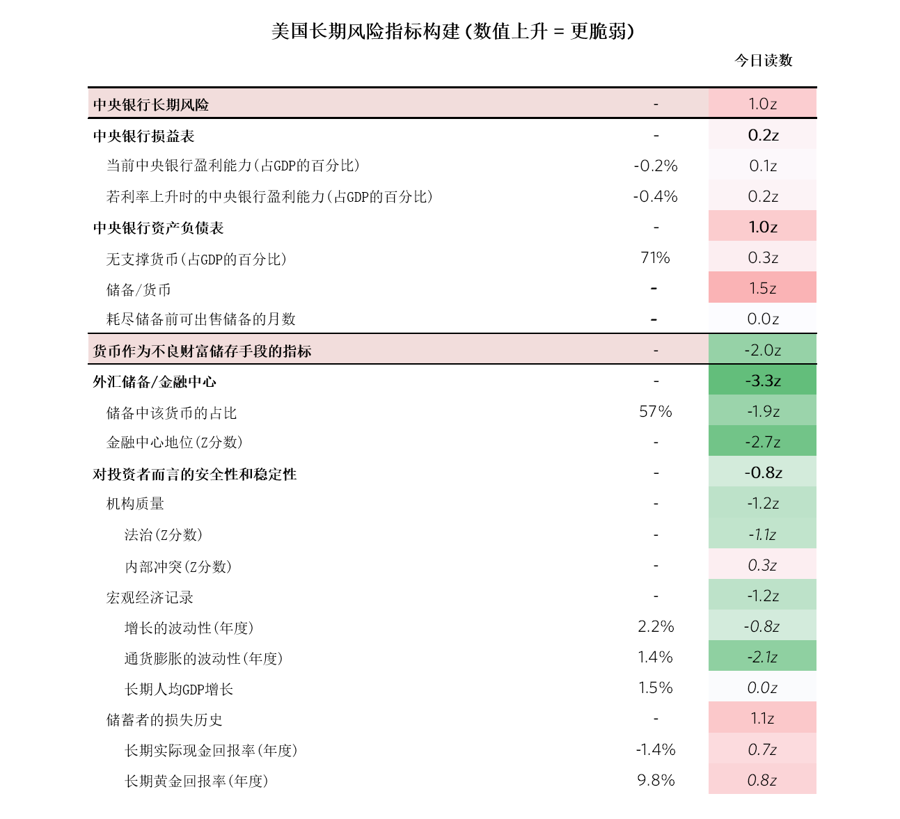 下表展示了一些对美国中央政府长期风险评级最为关键的指标。它是以Z分数来衡量的,也就是高于或低于平均值的标准差。你只需要知道,数值高于2就相当糟糕了。