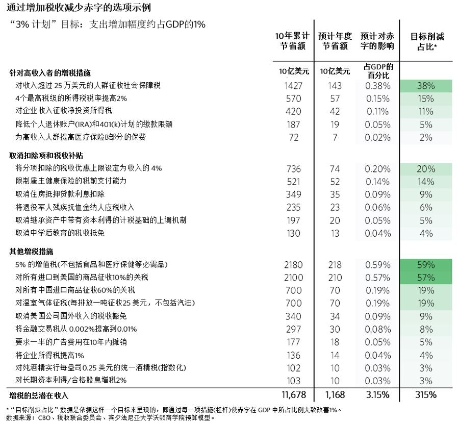 - 预算赤字应削减至GDP的3%(相较于CBO当前预测的约6%)。