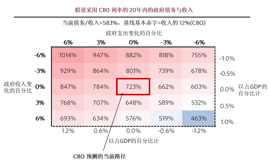 实现稳定政府债务相对于政府收入的目标,有点儿像是在玩魔方,因为调整一个杠杆会改变其他所有杠杆的影响。接下来的表格展示了政府支出削减、税收增加和利率变化的不同组合,将如何导致政府债务收入比的不同结果。