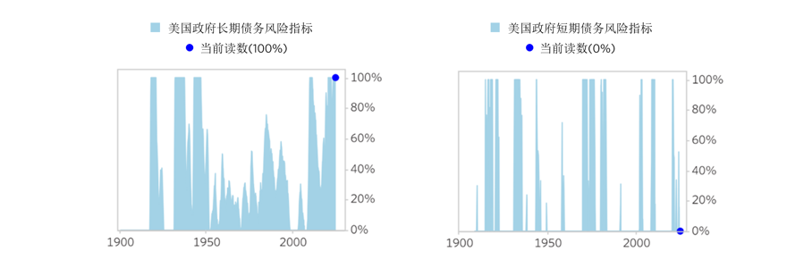 利用上述指标以及之前所描述的其他指标,我对中央政府和中央银行的长期风险(我把衡量这种风险类比为衡量患心脏病的长期风险)和短期风险(就像衡量心脏病实际发作的情况及其造成的损害)进行了评估。虽然短期风险往往是由于长期存在的脆弱性在突发问题中显现出来(就如同一个长期面临心脏病发作风险的人真的心脏病发作了),但情况并不总是如此。例如,即使潜在的长期脆弱性较低,也可能会出现像新冠疫情这样的大流行病,或者爆发战争,这会导致更高的短期风险,而这会在这个风险指标中体现为数值上升。我对美国长期和短期风险的评估结果显示在接下来的图表中。请注意,尽管这些是很好的指标,但就像大多数预测某人是否会心脏病发作的先行指标一样,由于之前所解释的原因,它们并不是非常精确。