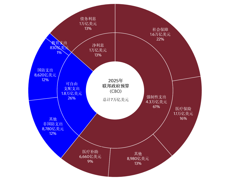 在考虑削减哪些支出时,只要稍加审视可能性,便会迅速注意到,约70% 的非利息支出被视为“强制性”支出。也就是说,这些支出要么是合同规定的,要么在政治上几乎不可能削减。具体分类如下图所示。