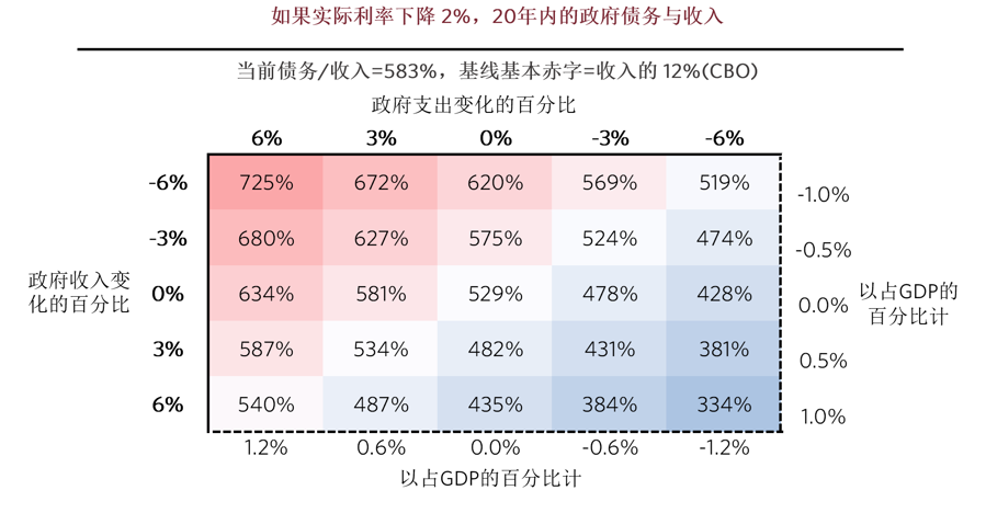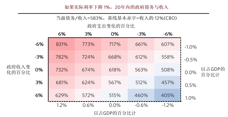 在下面两个表格中,我展示了如果实际利率下降1%或2%(最终比实际增长率低1.5%~2.5%)时的相同敏感性。它们有助于你了解不同政策组合的影响。